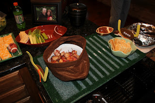 Scott cut the board, I stapled down some astroturf, taped off and sprayed the lines, put some number stickers on and stapled on some goal posts ... easy peasy! Oh, and the football on the board is actually a hat that I found at Walmart. Just put a bowl inside and it's such a cuter way to have the bowl of apps on the board.